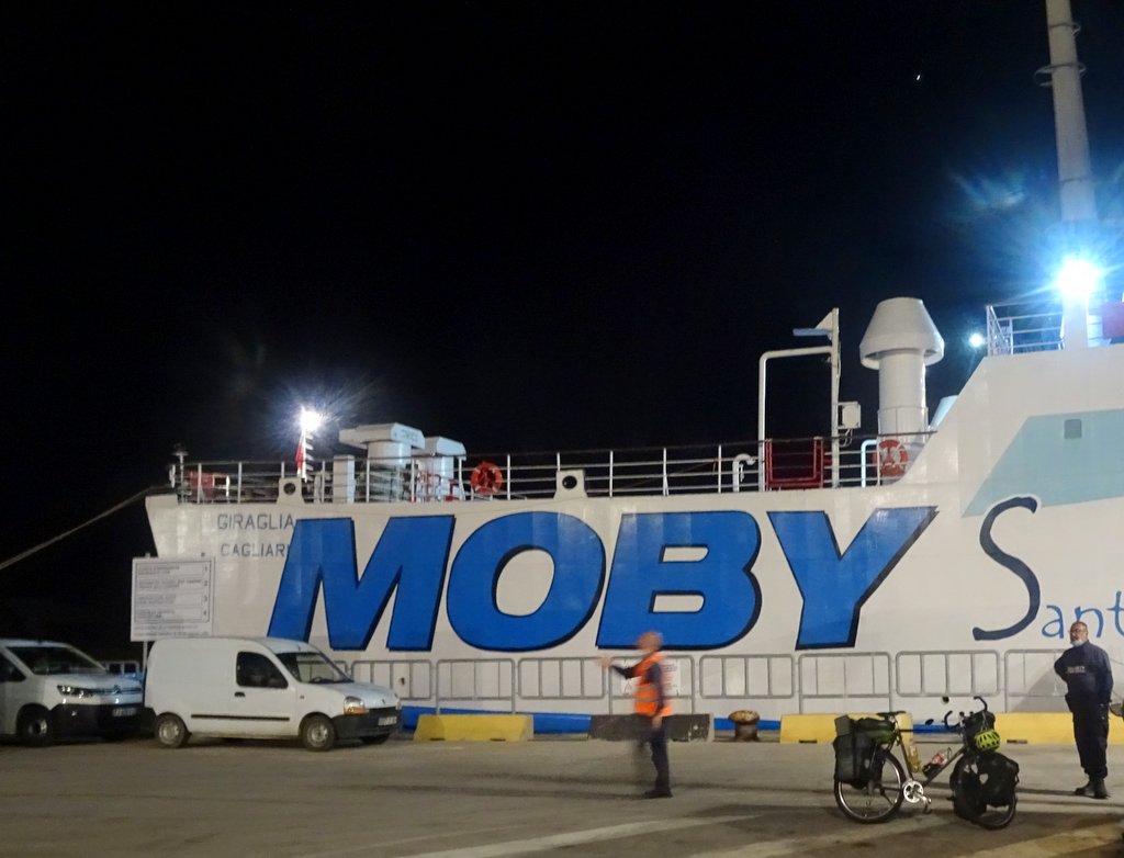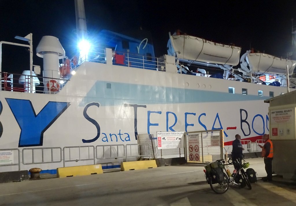 A la descente du bateau, trois policiers italiens sont d'astreinte. Descendu dans les tout premiers du ferry, je pousse mon vélo, passe devant ces messieurs, leur fais un grand salut de la tête, et ne me retourne plus. Personne ne me hèle … Je suis en Sardaigne à Santa Teresa Gallura. Tous ces papiers et analyse que j'ai minutieusement préparés … n'ont servi à rien. Belle issue finalement. Dans la nuit, j'avais imaginé plein de scenari jusqu'à la quarantaine en Sardaigne … Comme quoi le scenario le plus simple reste souvent le plus réaliste : saluer poliment la représentation de la maréchaussée et filer le train sans se retourner. Tigre de papierssss donc pour cette covid-19 !