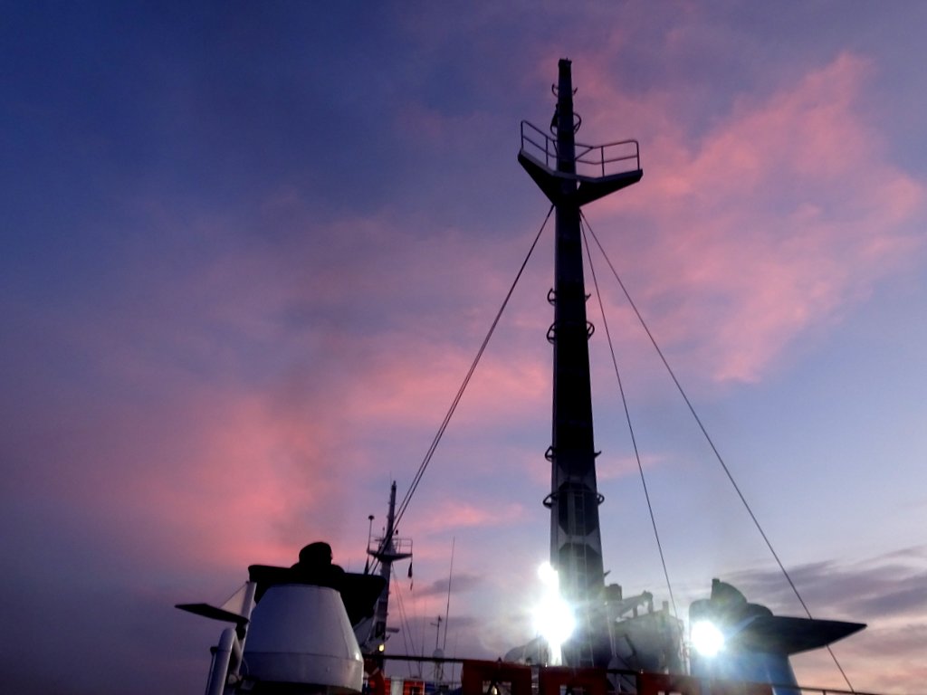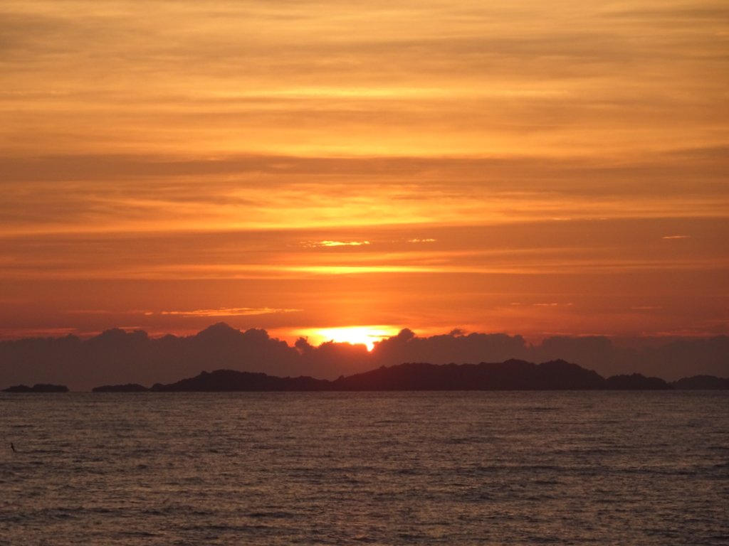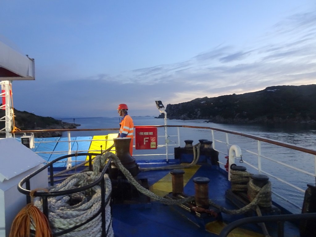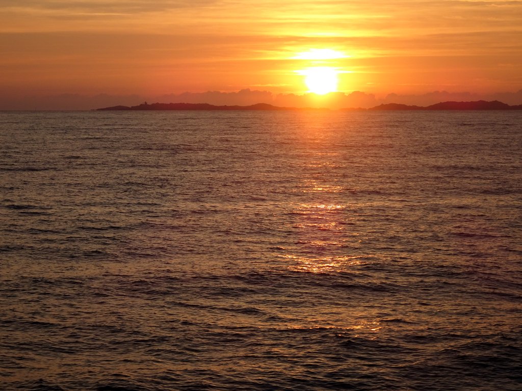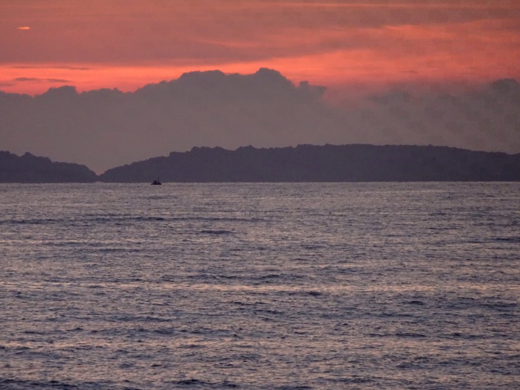 Il fait nuit noire ce matin à Santa Teresa Di Gallura lorsque j'harnache le Mulet. Direction les quais d'embarquement pour Bonifacio. Le ferry de la compagnie Moby est là, toutes lumières allumées. Un policier me salue avec le respect dû à la charge du vélo, et m'invite à me mettre au premier rang pour embarquer. Quelques véhicules sont déjà là. Il est 6h30. J'apprendrai à Figari qu'aucune traversée Bonifacio – Santa Teresa n'a été possible durant au moins trois jours consécutifs en raison du mauvais temps : tiens ici aussi ? … La remontée vers Bonifacio se fait dans une fraîcheur très supportable pour rester sur le pont suivre la naissance du jour sur les îles Lawesi. Le bateau a une trentaine de passagers. Le ferry recule puis tourne sur lui-même pour pointer la belle cité Corse. Un peu de houle donne du roulis. Accroche-toi ! Par précaution j'ai ficelé le Mulet au bastinguage. Le disque solaire émerge des nuages à l'horizon. Les fumées noires des deux cheminées font réfléchir au … bilan carbone. L'entrée dans le port de Bonifacio fait diminuer la vitesse. On accoste en tout début de quai laissant tous les voiliers plus au fond. Le signal du départ est donné. Le vélo sort en tête passe tranquilou devant un policier galonné. Pas de signe particulier. Je continue et sors sans aucun contrôle. Bon, excellente chose.