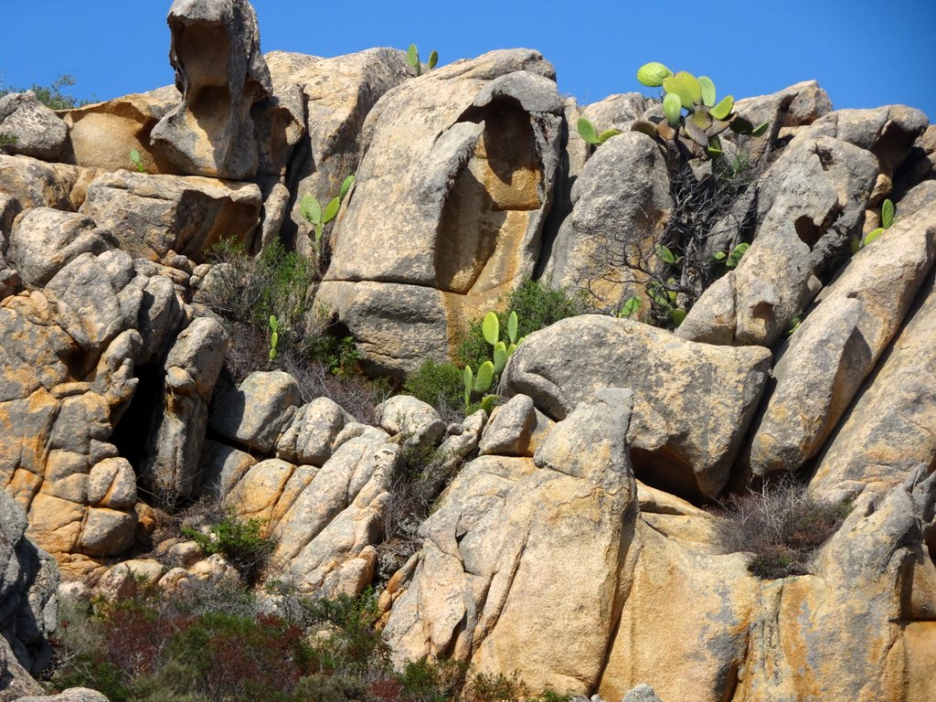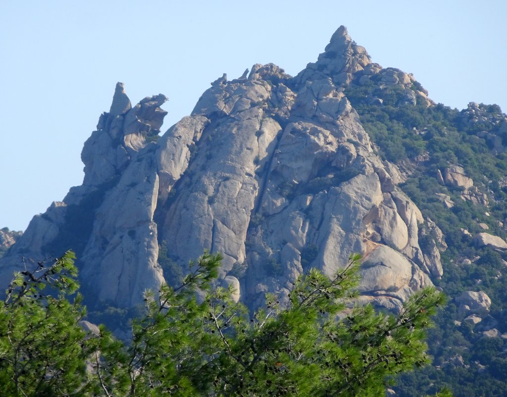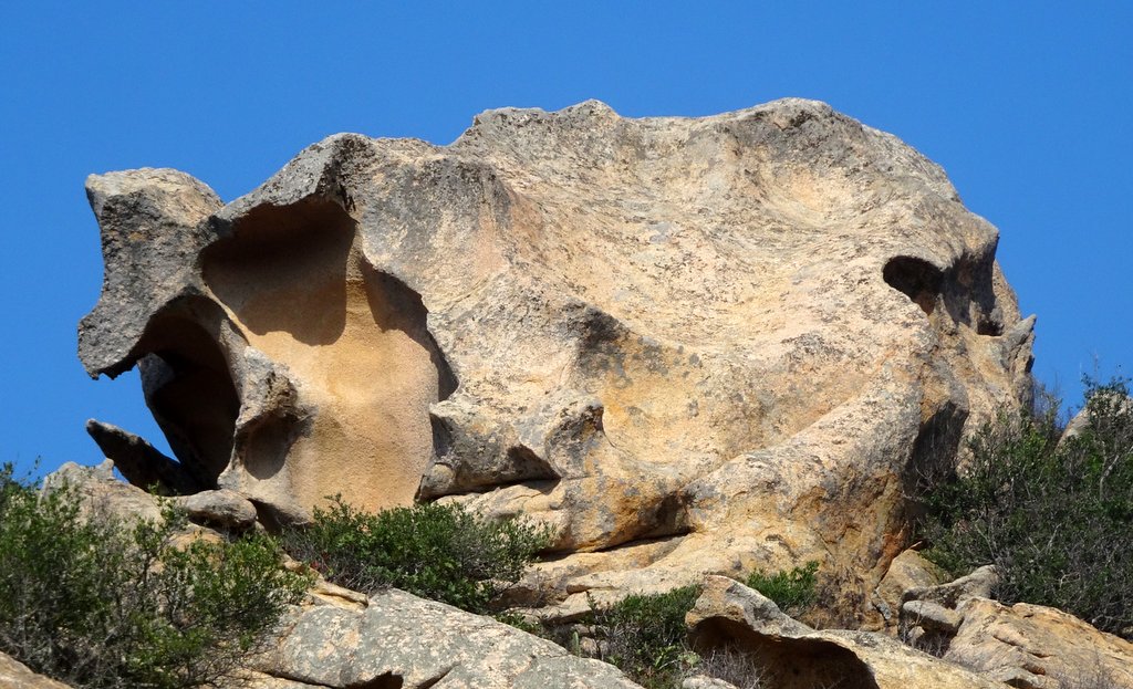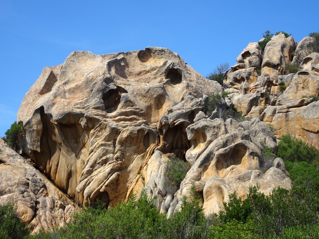 Aujourd'hui, quel que soit le temps, je dois partir … A l'habitude, les pluies redoublent d'intensité au lever du jour. Parfois, pourtant, ça se calme. Mais là, non, ce maudit temps ne cesse pas. Je boucle bien les sacoches, harnache le Mulet, mets le poncho avec le casque vissé sur la capuche et sur la casquette … pour le soleil !, et file dans les ruelles pentues de Orgosolo. J'ai repéré quelques points de passage : Oliena, Ulla biti … pour aboutir à La Caletta au bord de la Méditerranée. Les freins commencent à se faire entendre du fait de l'usure. Dans un virage à la sortie de Orgosolo une peinture très originale – et probablement très connue : deux rochers côte à côte ont pris forme humaine représentant un bipède faisant la sieste une main sur le ventre. Assez original.