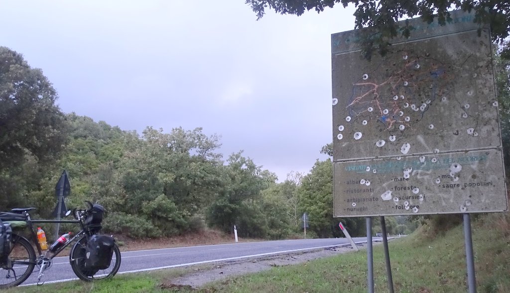 Ce sont surtout les montées qui sont marquantes. Le vent tourbillonnant n'arrange pas les choses. Je me trompe dans un embranchement et suis contraint de monter dans des pistes empierrées. Heureusement la circulation est quasi nulle. Je pense ne pas atteindre la petite ville Orgasolo. J'ai toujours un peu de nourriture et la tente. Bout de gruyère avec du pain, banane, jus de fruit, ce sera le casse-croûte de la virée.
