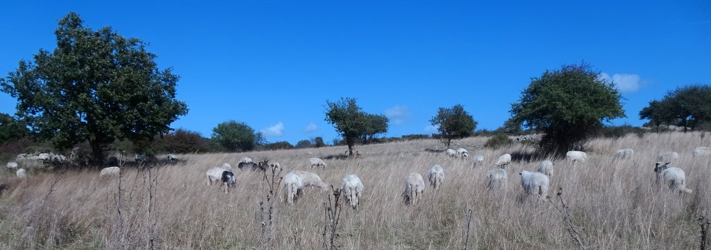 Versant Est de la Sardaigne, on trouve des cultures connues : ici la vigne est reine. D'immenses étendues de vigne à culture traditionnelle sont présentes qui enjolivent le paysage. Des troupeaux de brebis sont aussi présents gardées par le réputé Patou, chien blanc des Pyrénées, qui a l'oeil et … la gueule pour avertir lorsqu'un mouvement inhabituel se fait sentir. Il fait son boulot ! Les deux tiers du trajet aujourd'hui se font en parallèle à une quatre voies interdites aux cyclistes. C'est une ancienne route, large, qui est devenue délaissée par les véhicules, donc excellente pour une piste cyclabe. Un bonheur de la parcourir et, en plus, les descentes sont plus fréquentes que les montées. Sous la pluie, c'est une bénédiction !