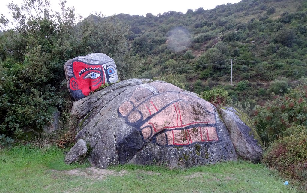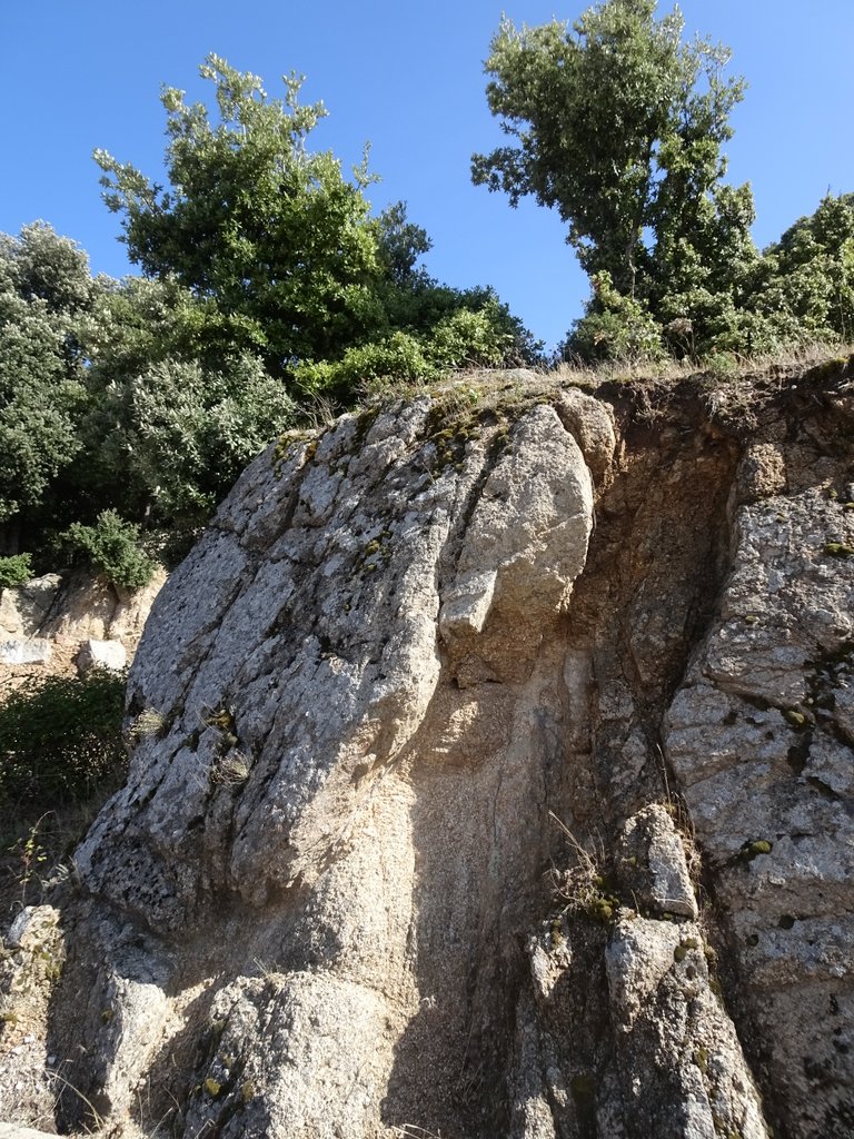 Aujourd'hui, quel que soit le temps, je dois partir … A l'habitude, les pluies redoublent d'intensité au lever du jour. Parfois, pourtant, ça se calme. Mais là, non, ce maudit temps ne cesse pas. Je boucle bien les sacoches, harnache le Mulet, mets le poncho avec le casque vissé sur la capuche et sur la casquette … pour le soleil !, et file dans les ruelles pentues de Orgosolo. J'ai repéré quelques points de passage : Oliena, Ulla biti … pour aboutir à La Caletta au bord de la Méditerranée. Les freins commencent à se faire entendre du fait de l'usure. Dans un virage à la sortie de Orgosolo une peinture très originale – et probablement très connue : deux rochers côte à côte ont pris forme humaine représentant un bipède faisant la sieste une main sur le ventre. Assez original.