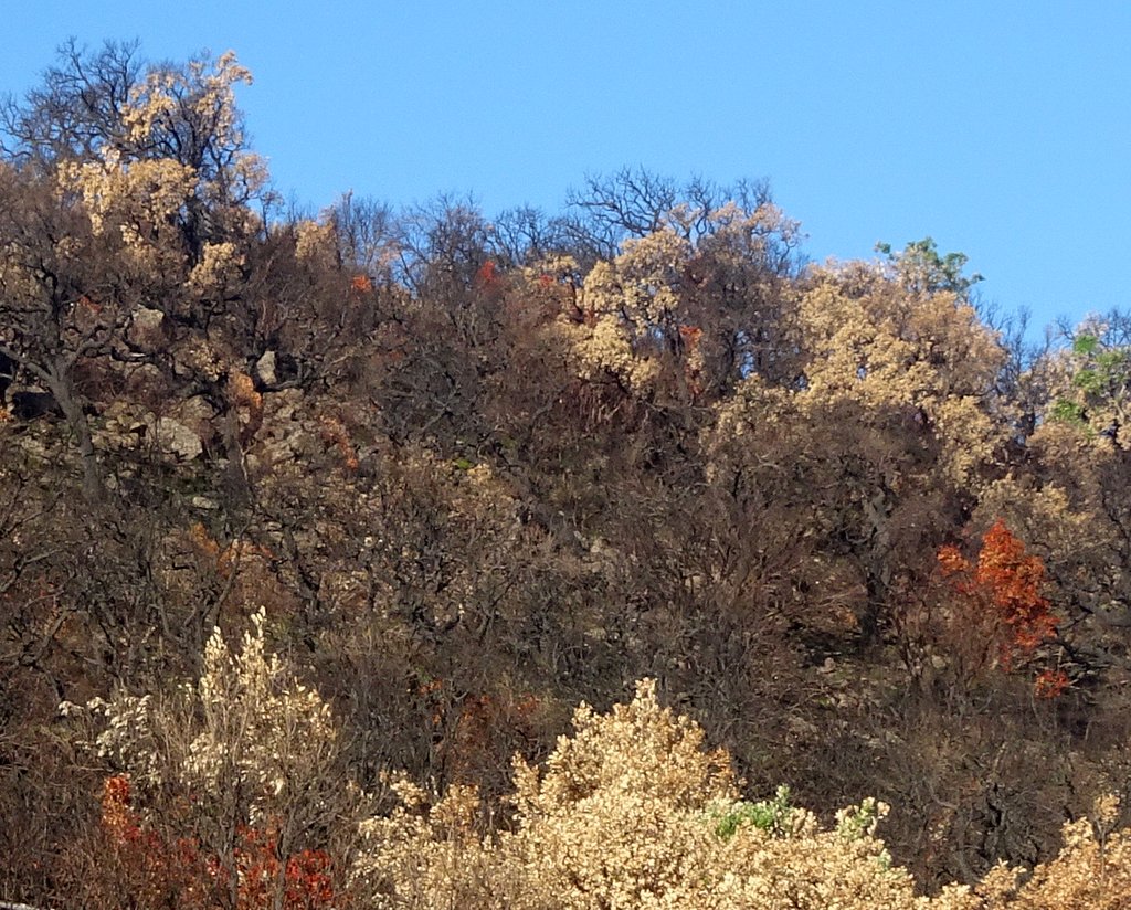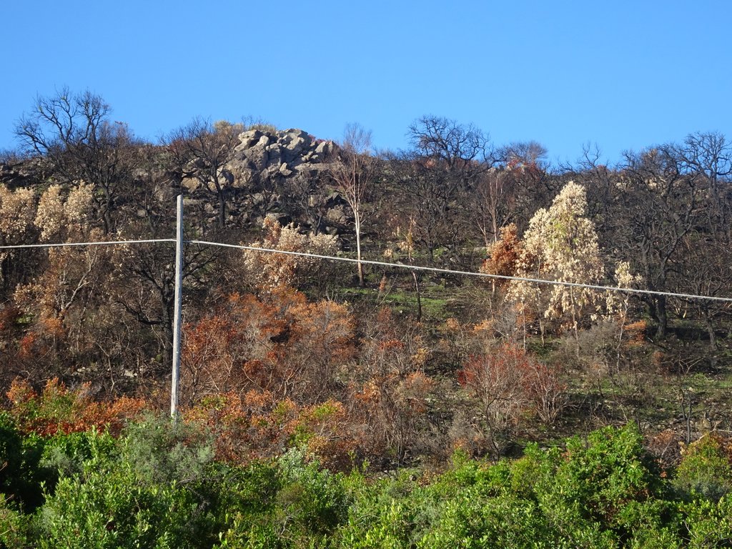 En fait, on ne longe pas trop la côte mais on passe de points touristiques en ronds-points d'accès aux plages. La forêt à ma gauche a sacrément brûlé sur pas mal de kilomètres. Les couleurs ocres, noires, jaunes donnent au passant que je suis de belles compositions esthétiques. Pas une maison n'a été touchée. Cette étape sent le commencement de la fin de mon périple. Normal, le beau temps est revenu ! Les trente derniers kilomètres avant Olbia la grosse ville sont … redoutables pour la sécurité des deux roues. La chaussée est relativement étroite avec de part et d'autre des ridelles métalliques en continu ne permettant aucun écart au cycliste d'autant que les bas-côtés sont inexistants. Lorsqu'un véhicule arrive par derrière, il est obligé de mordre largement sur l'autre sens de circulation pour m'éviter, donc il est impossible d'avoir de front un véhicule dans un sens, un autre dans l'autre sens et le bipède à vélo. Le regard dans le rétroviseur est quasi constant car les véhicules doivent absolument ralentir très fort dans les cas où, en face, d'autres véhicules arrivent. Aucune échappatoire n'est possible pour le cycliste du fait des ridelles continues. Bon, on a vu pire …
